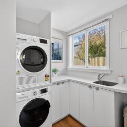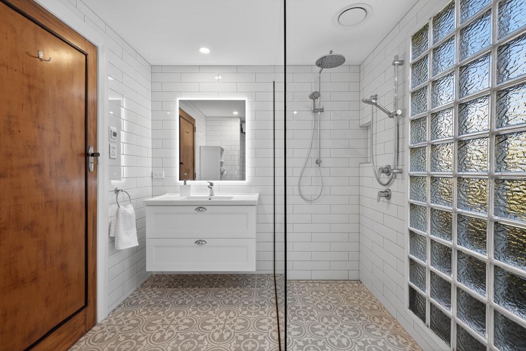 Downstairs, the main bedroom offers privacy and convenience near the living areas. The ground floor also features a stylish modern bathroom with a spacious shower, plus a separate laundry and guest toilet.