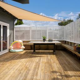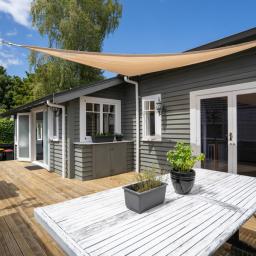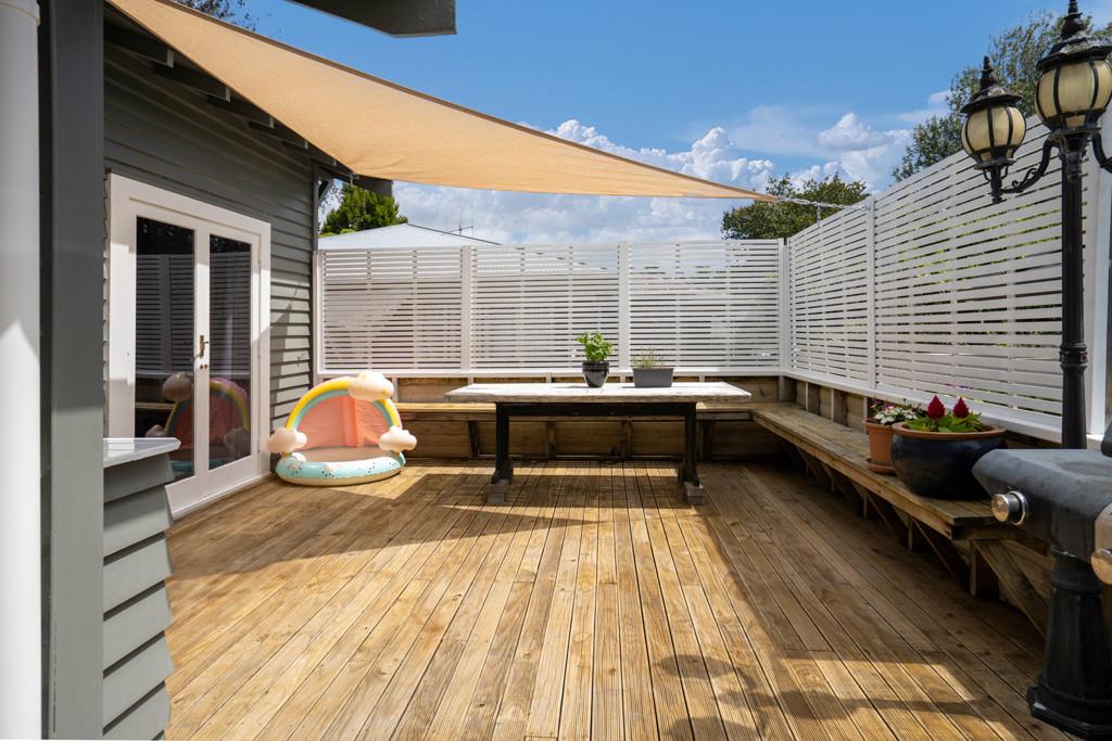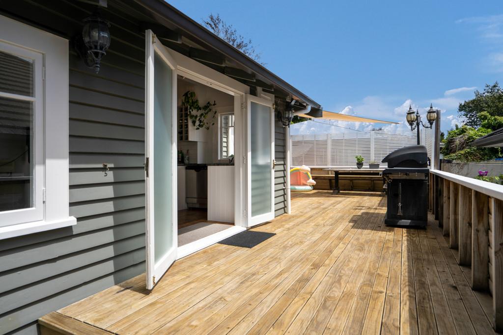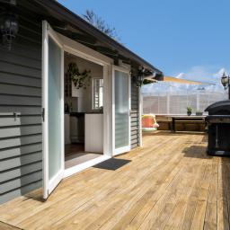 French doors open out from the kitchen onto a sunny north facing deck, perfect to enjoy a morning coffee and long summer evenings.