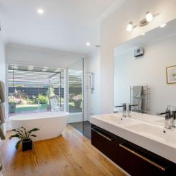 The bathrooms are simply breathtaking. The main bathroom feels like a private spa retreat, with a striking feature window framing the garden, a freestanding bath perfectly positioned for relaxation, and an oversized fully tiled shower. The master suite is generously proportioned and offers its own sanctuary, complete with walk-in robe and beautifully finished ensuite with double basins and tiled shower.