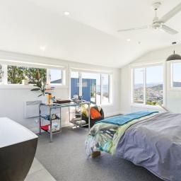 - Four bedrooms and two bathrooms, including an ensuite for the master suite, which occupies the top level, boasting a large walk-in wardrobe and sweeping views over the city and harbour on one side and tranquil bush-clad hills on the other