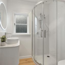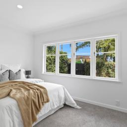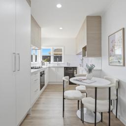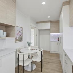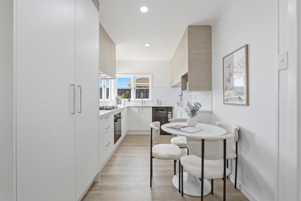 The kitchen is both functional and stylish, featuring brand new Midea appliances, an air-fry oven, gas cooking, infinity hot water, tiled splashback, generous storage and space for a double-door fridge. A dishwasher and ample cabinetry ensure practicality for busy households.