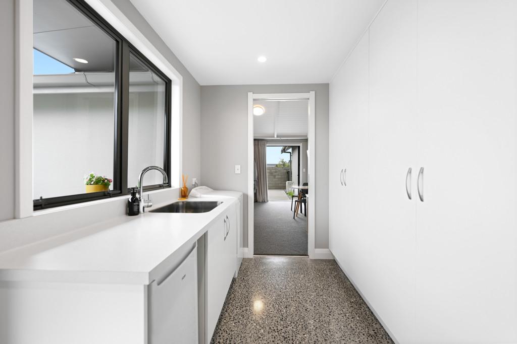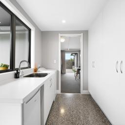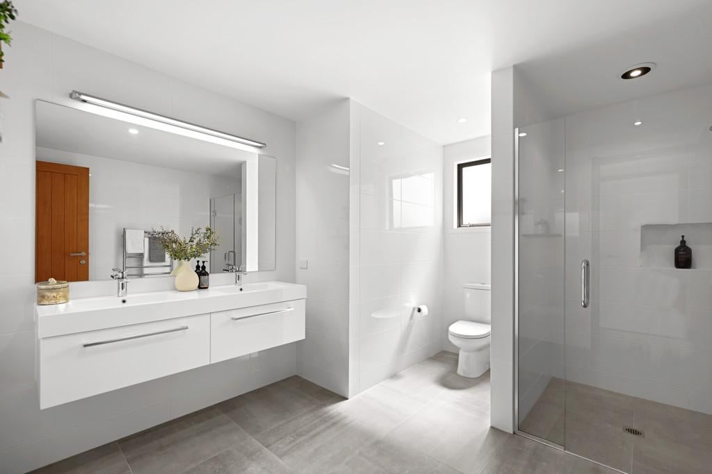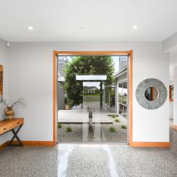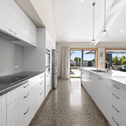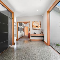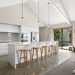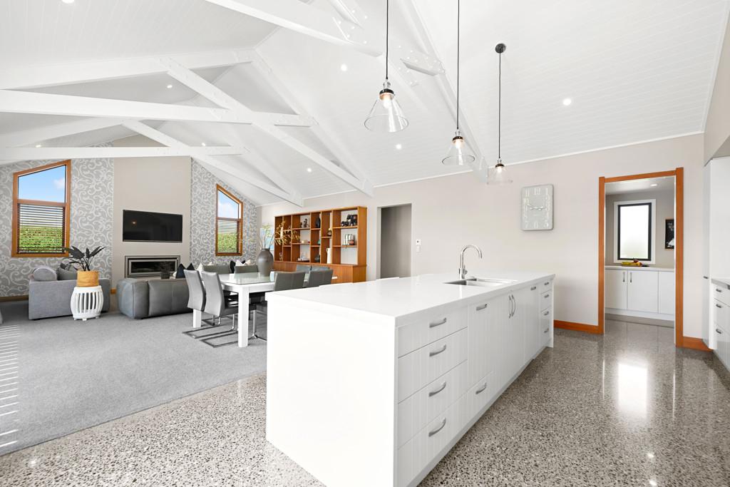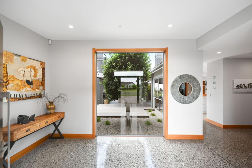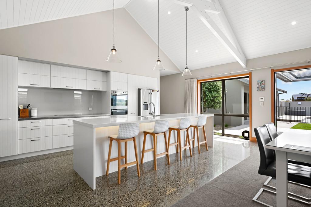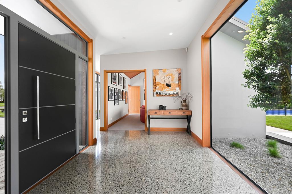 Polished concrete floors with underfloor heating through the main hallways and kitchen, oversized Victorian Ash high-stud doors, and architraves further elevate the sense of sophistication and scale.