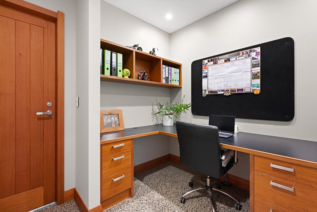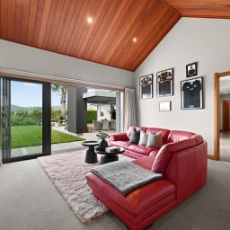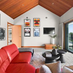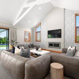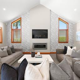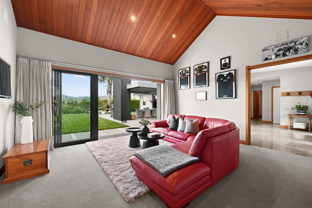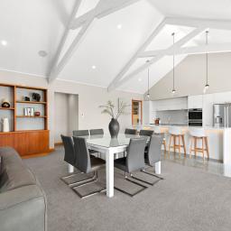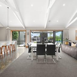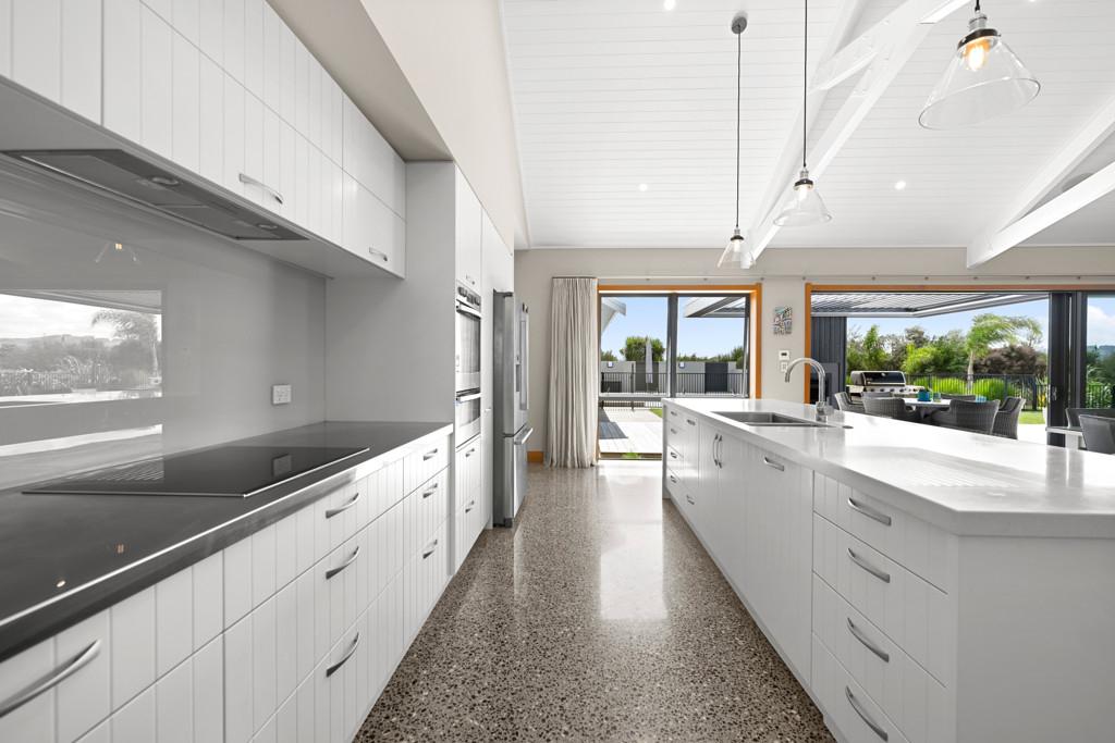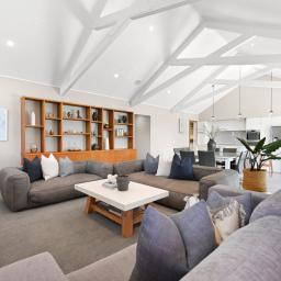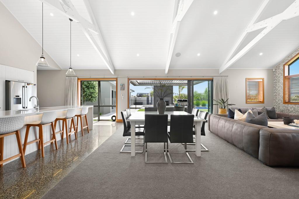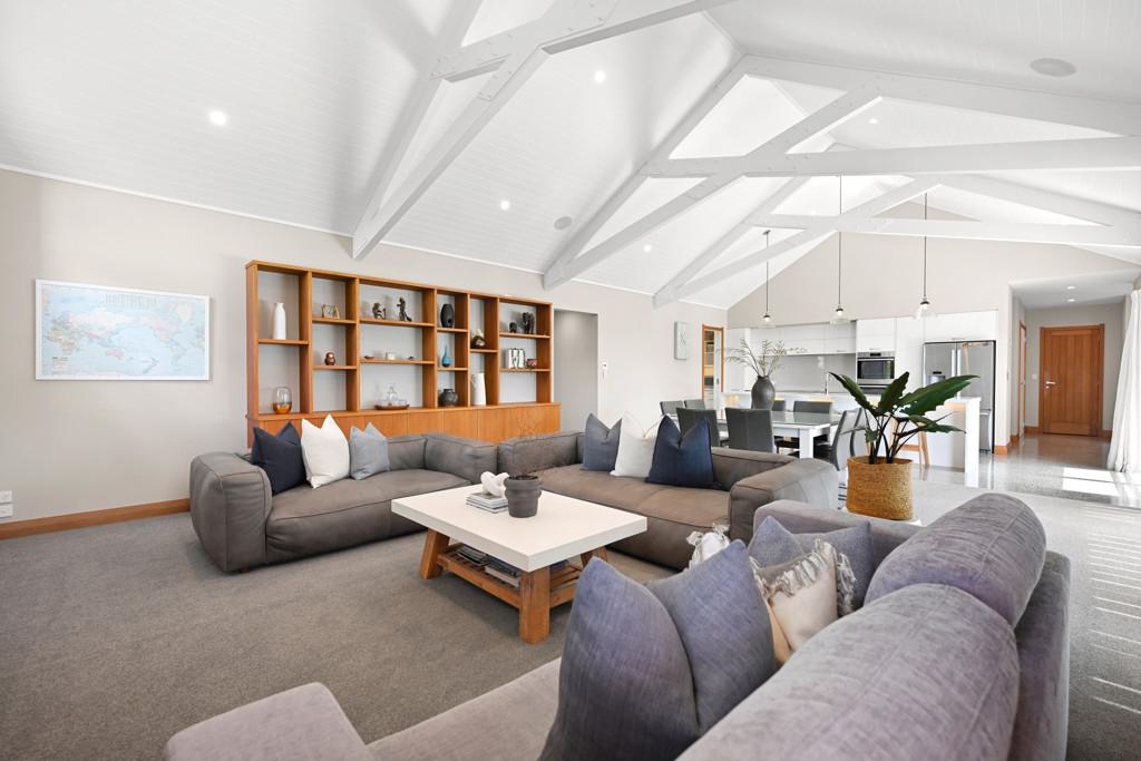 From the moment you arrive, the architectural presence commands attention, framing the skyline with striking confidence. Step inside and you're immediately drawn to the expansive open plan living area. The designer kitchen, complete with a generous pantry flows effortlessly into the dining and living areas, forming the heart of the home. Bespoke built-in cabinetry, soaring raked ceilings, and handcrafted exposed beams showcase exceptional craftsmanship and structural beauty throughout. Seamless indoor/outdoor flow leads to a substantial deck with Louvretec, creating the perfect all season entertaining space.