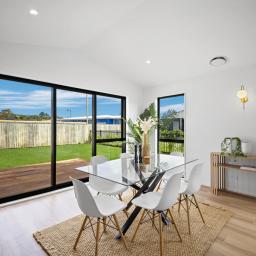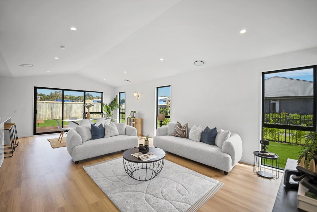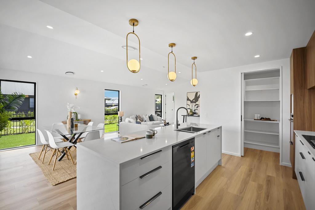 The heart of the home is the light-filled open-plan kitchen, dining, and living area with high cathedral ceilings, designed for effortless everyday living and entertaining. The designer kitchen is a standout, featuring quality appliances and a walk-in pantry. Sliding doors open to a sunny, easy-care yet generous yard that overlooks a peaceful reserve boundary, providing a serene outdoor retreat and a generous space for family gatherings. A separate lounge offers a quiet sanctuary for relaxing or family movie nights.