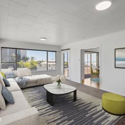 Inside, three double bedrooms with built-in storage are complemented by a modern designer kitchen, contemporary bathroom, and dedicated laundry. Tidy decor, and a neutral colour palette create a fresh, welcoming interior, while the option to reinstate lift access adds further convenience.