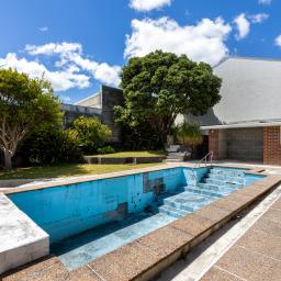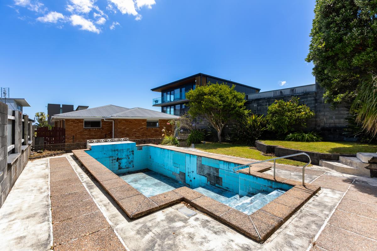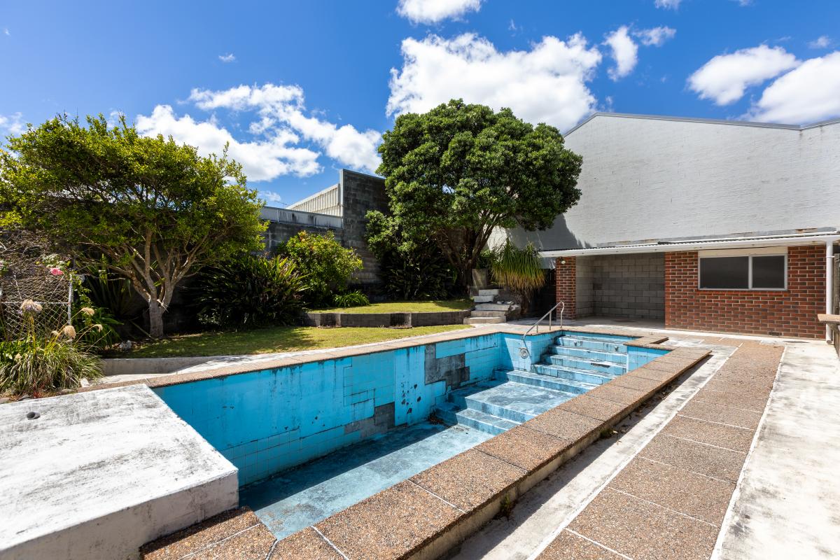At the rear, a private garden and unused pool present exciting opportunities to remodel, redesign, or create your own stylish outdoor retreat.