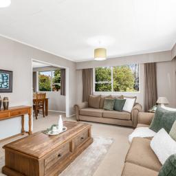 Inside, the layout is functional and family-focused. Three well-proportioned bedrooms are supported by a central family bathroom, while the generous living area provides a versatile space for everyday life. A separate kitchen connects easily to the dining area and lounge, creating defined yet connected zones for meals, entertaining, and downtime.