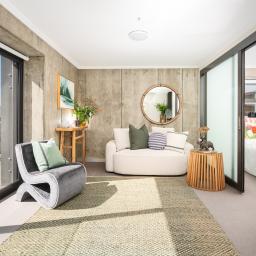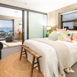 Inside, the design is contemporary and confident, with a striking exposed concrete wall adding a subtle brutalist edge to the living space. Floor-to-ceiling sliding windows frame spectacular views across the city and harbour - an outlook that instantly softens the pace of the day and creates a true sense of escape from the activity below.