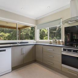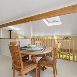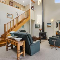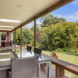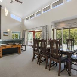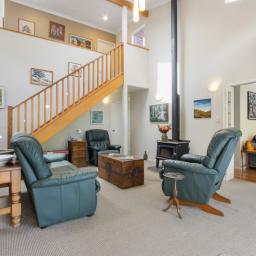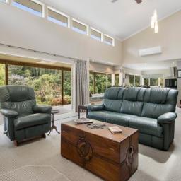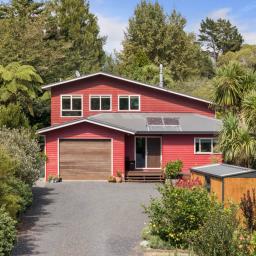 Hidden away yet just minutes from town, this beautifully crafted, unique home, offers tranquility, space and modern comfort. Sun filled living areas flow to sheltered, covered decks, while a grand wooden staircase, cathedral ceilings and skylights create an uplifting sense of openness. With three bedrooms, a study and three living areas, the layout suits families, guests or creative work.
