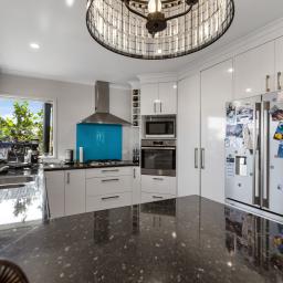 The kitchen is light and bright, featuring white cabinetry, black granite-look laminate benchtops, a blue glass splashback, gas hob, and electric wall oven - well positioned at the heart of the home.