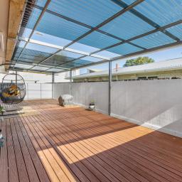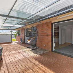 The welcoming foyer sits alongside the integrated double garage, with stairs leading to the upper level. To the right, sun-filled open-plan living unfolds - kitchen, dining, and lounge seamlessly connected for everyday living and entertaining. Stacker sliders extend the living spaces out to a large north-facing timber deck, now fully covered to provide shelter and year-round usability. This addition has effectively created another spacious living zone - perfect for gatherings with family and friends, rain or shine.