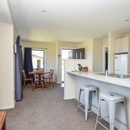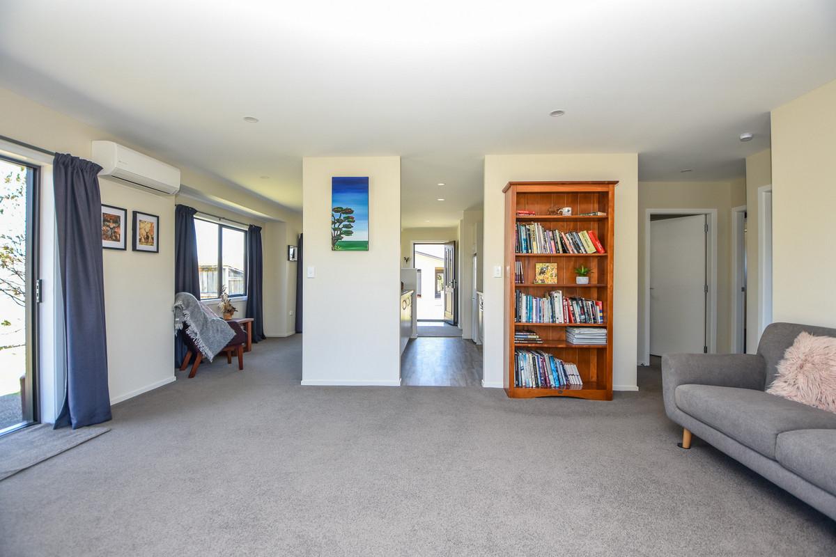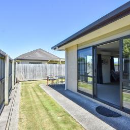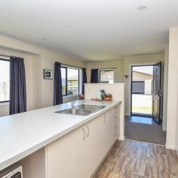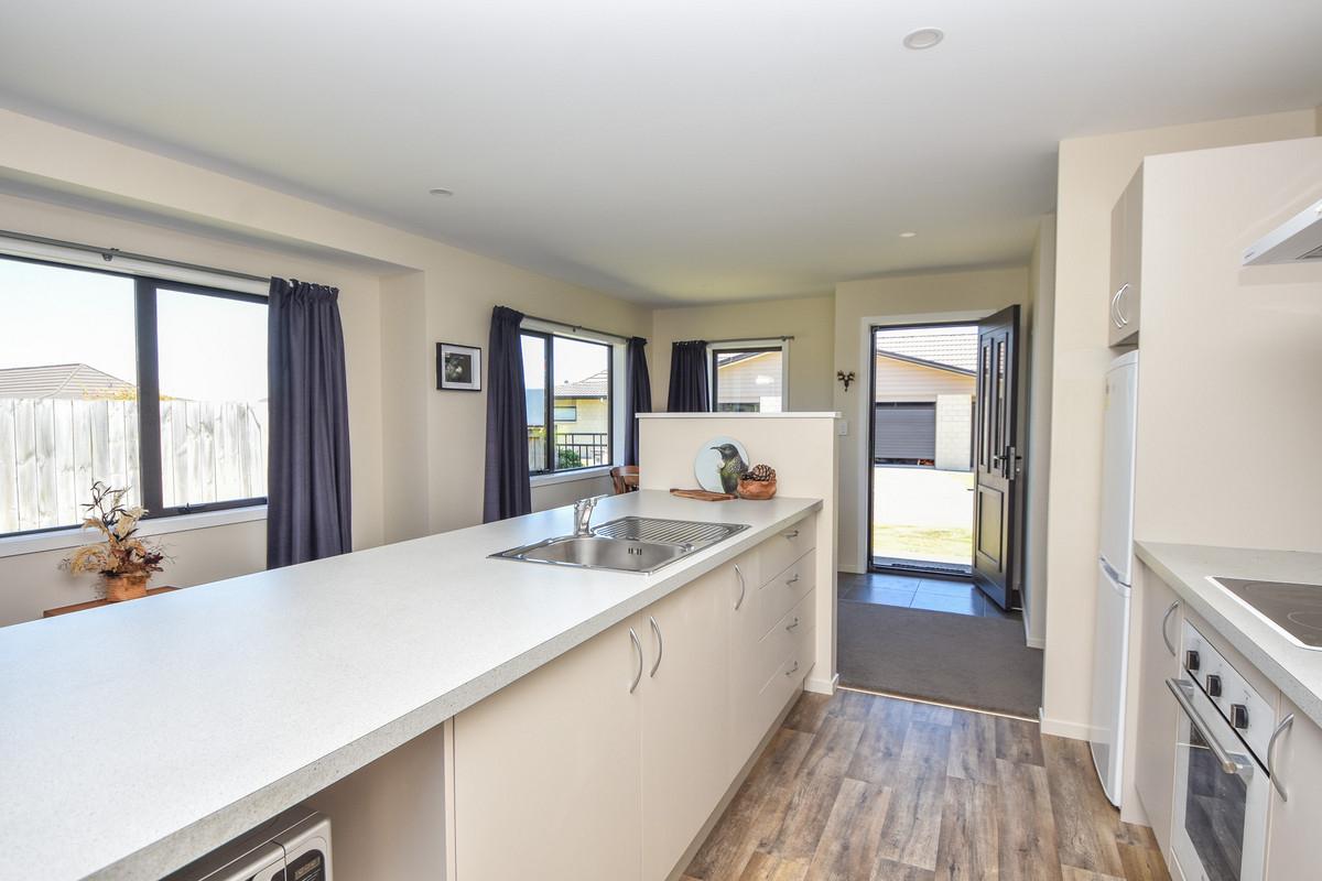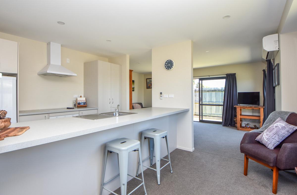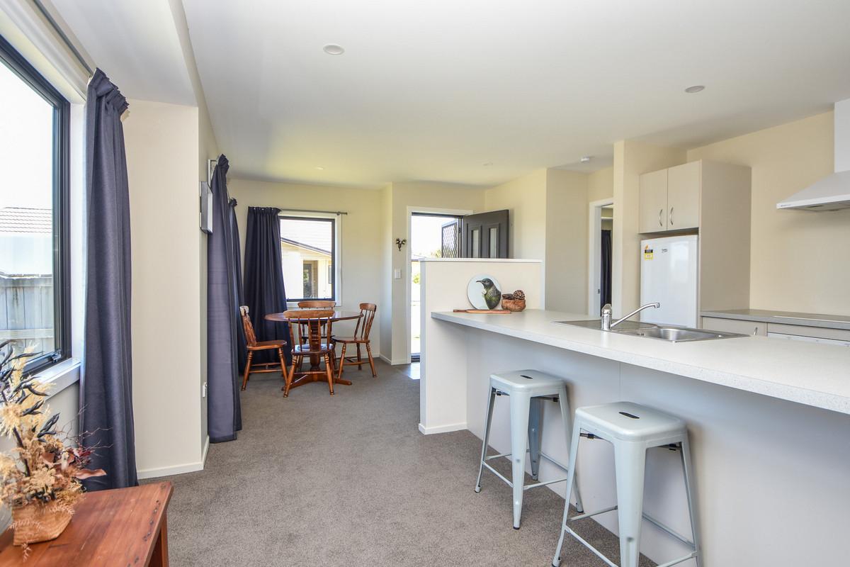 The home features a practical open-plan layout with a centrally positioned kitchen and a light-filled lounge. Two sets of sliding doors open out to a private patio and easy-care grounds, with scope to personalise the garden to suit your taste. A well-appointed bathroom includes a wet-floor shower for ease and comfort, while the single internal garage provides secure parking and storage.
