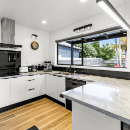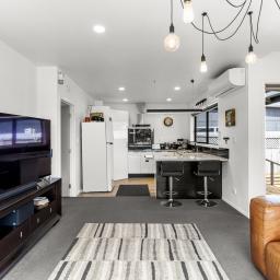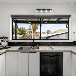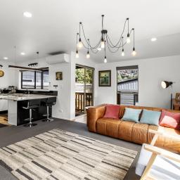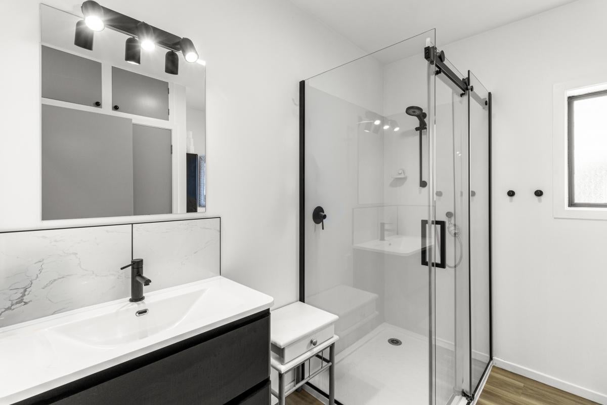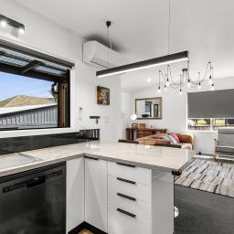 The modern, light-filled kitchen is a standout, featuring a sleek mirrored splashback and breakfast bar, flowing seamlessly into open-plan living. Comfort is assured year-round with two heat pumps (in both the living and main bedroom), while gas Infinity hot water adds everyday efficiency. The bathroom has been tastefully updated with a modern vanity, shower, black fittings and wooden plank flooring.