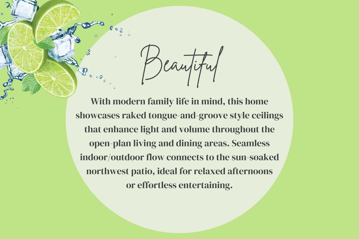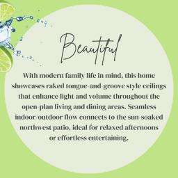 BEAUTIFUL: With modern family life in mind, this home showcases raked tongue-and-groove style ceilings that enhance light and volume throughout the open-plan living and dining areas. Seamless indoor/outdoor flow connects to the sun-soaked northwest patio, ideal for relaxed afternoons or effortless entertaining.