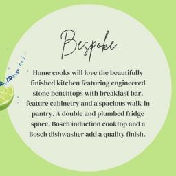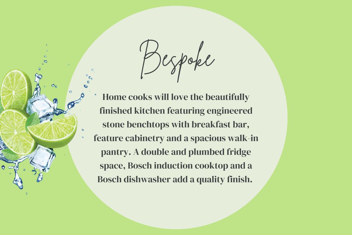 BESPOKE: Home cooks will love the beautifully finished kitchen featuring engineered stone benchtops with breakfast bar, feature cabinetry and a spacious walk-in pantry. A double and plumbed fridge space, Bosch induction cooktop and a Bosch dishwasher add a quality finish.