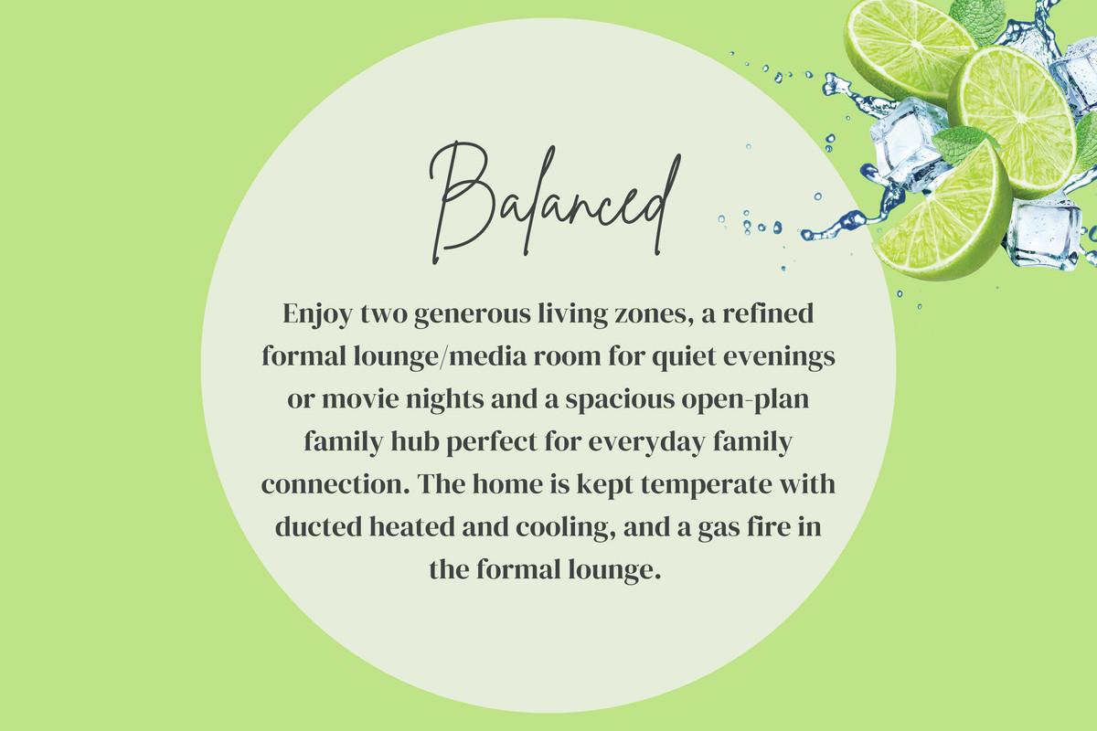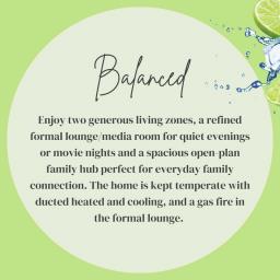 BALANCED: Enjoy two generous living zones, a refined formal lounge/media room for quiet evenings or movie nights and a spacious open-plan family hub perfect for everyday family connection. The home is kept temperate with ducted heated and cooling, and a gas fire in the formal lounge.