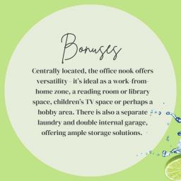 BONUSES: Centrally located, the office nook offers versatility - it's ideal as a work-from-home zone, a reading room or library space, children's TV space or perhaps a hobby area. There is also a separate laundry and double internal garage, offering ample storage solutions.