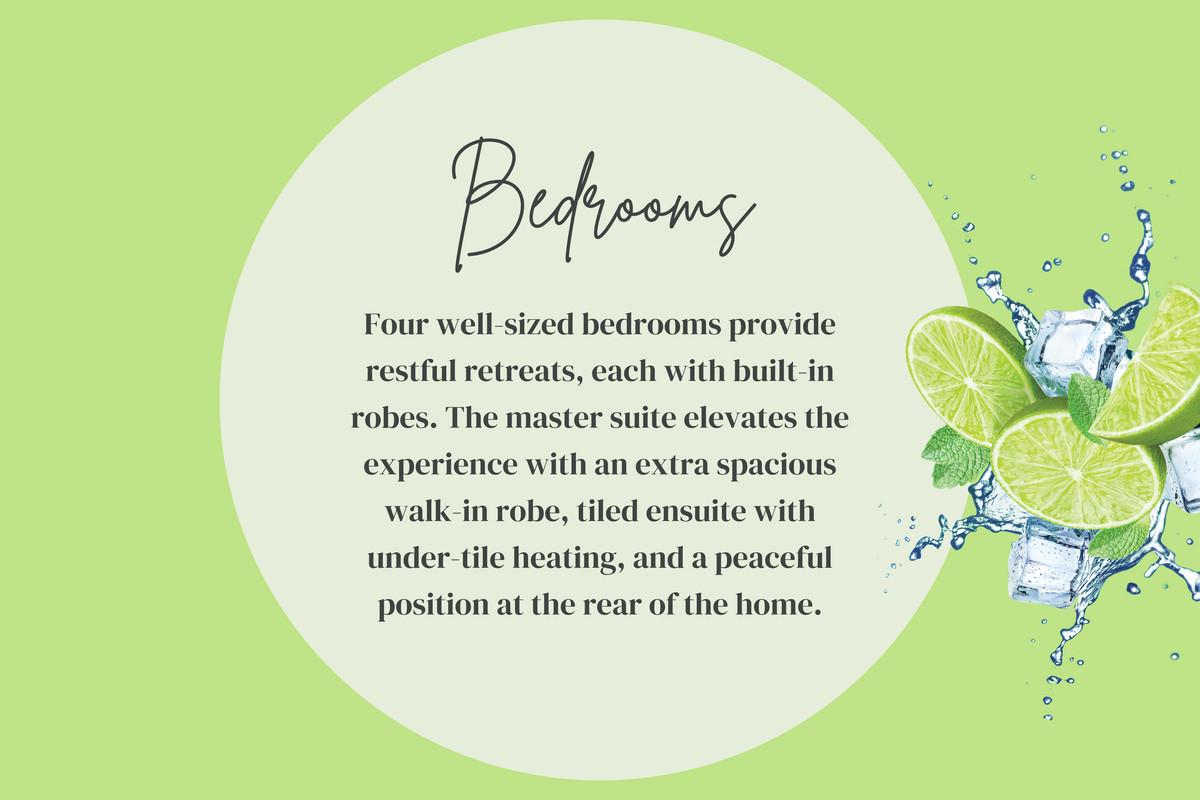 BEDROOMS: Four well-sized bedrooms provide restful retreats, each with built-in robes. The master suite elevates the experience with an extra spacious walk-in robe, tiled ensuite with under-tile heating, and a peaceful position at the rear of the home.