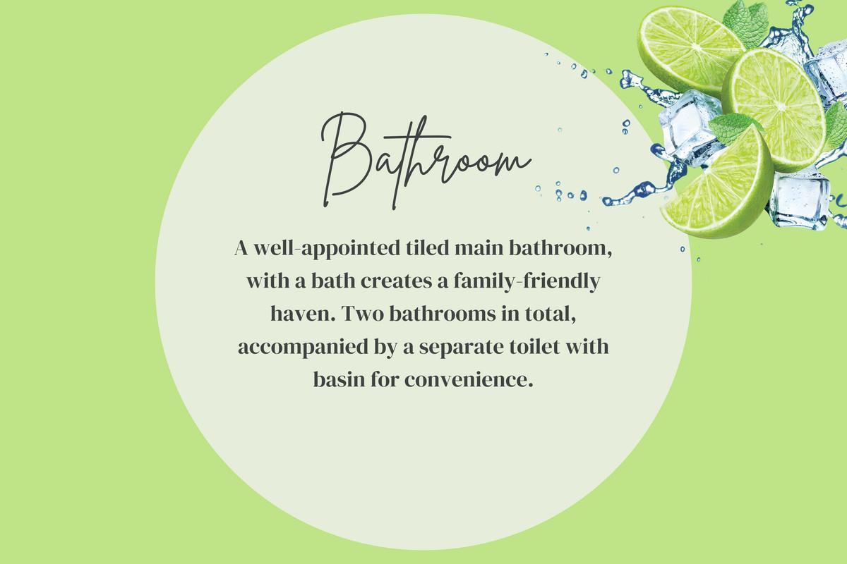 BATHROOM: A well-appointed tiled main bathroom, with a bath creates a family-friendly haven. Two bathrooms in total, accompanied by a separate toilet with basin for convenience.