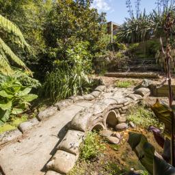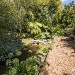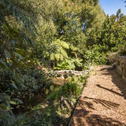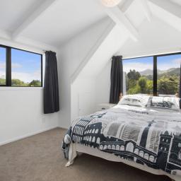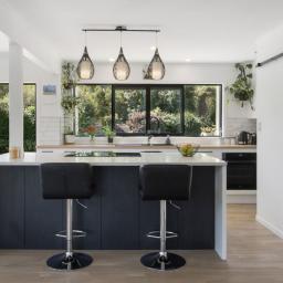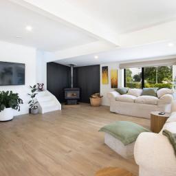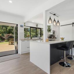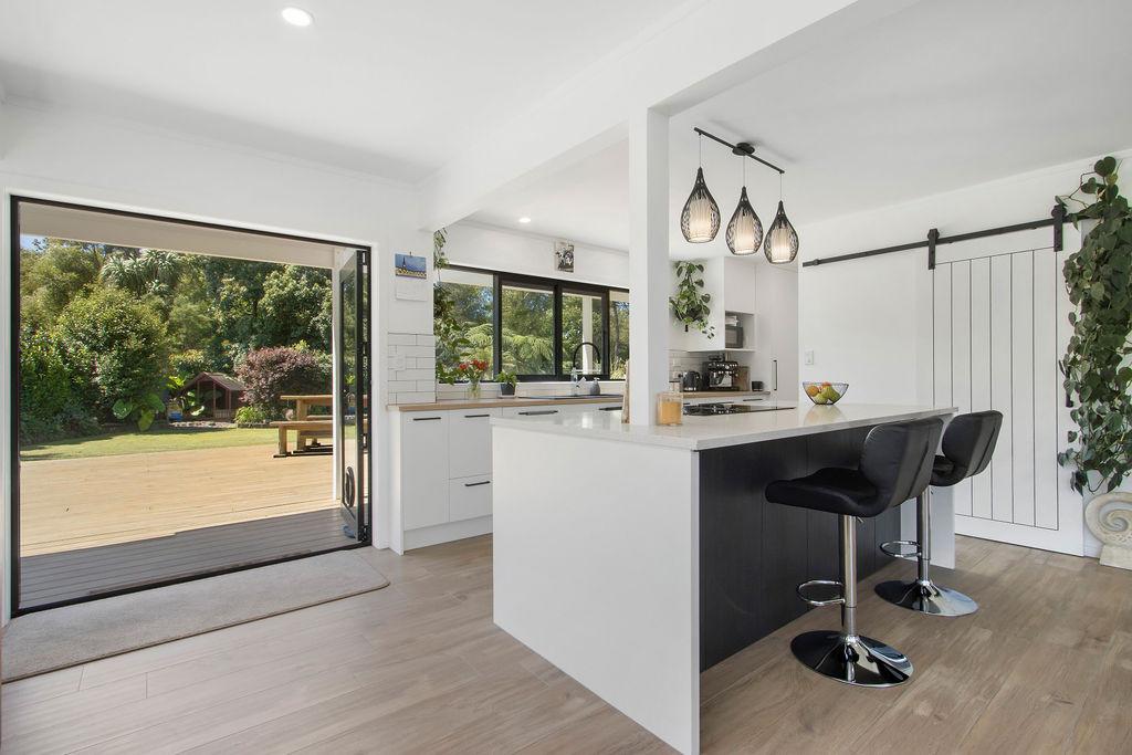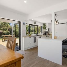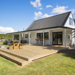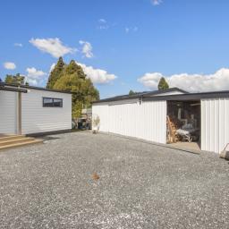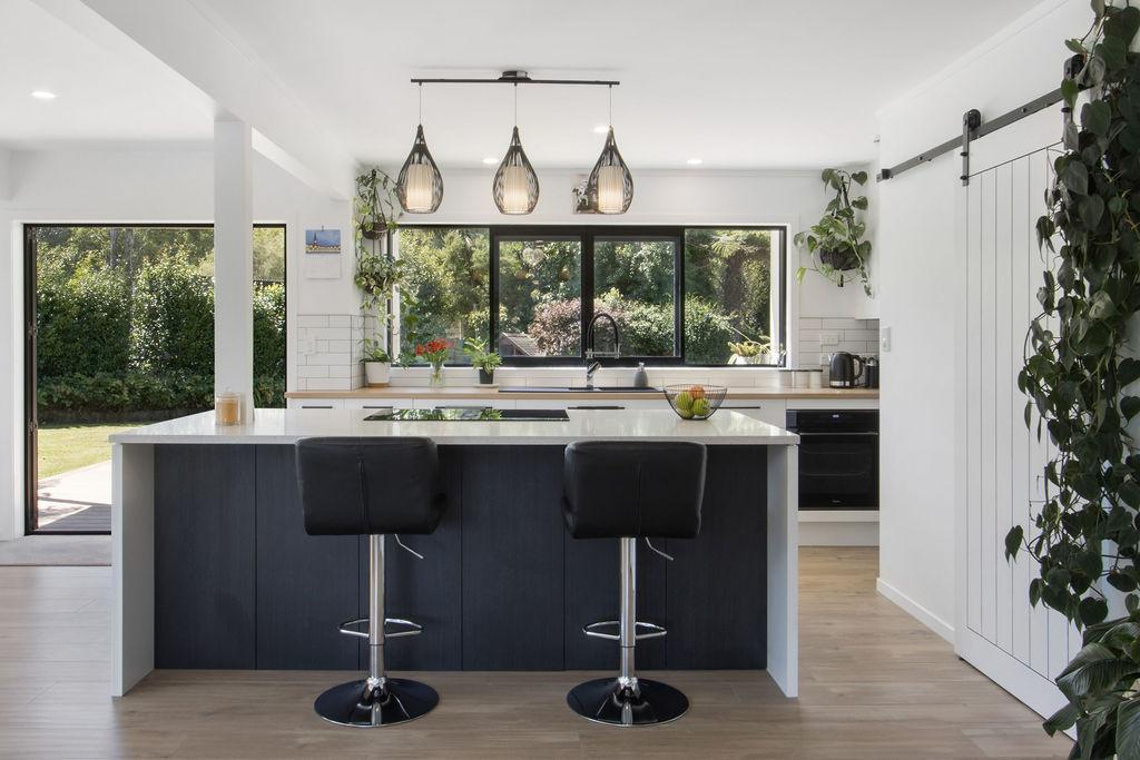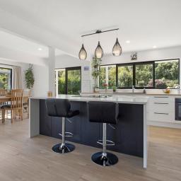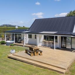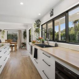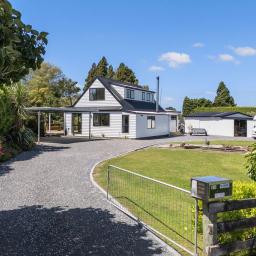 This striking black-and-white home makes an immediate impression. Positioned on a large corner site, the property offers exceptional privacy and space. The fully fenced section is a private retreat, complete with established gardens, raised vegetable boxes, and a peaceful stream running through the back of the section - creating a tranquil, lifestyle-focused setting.