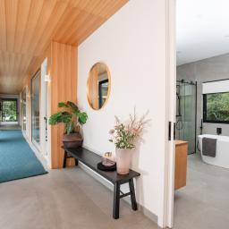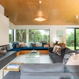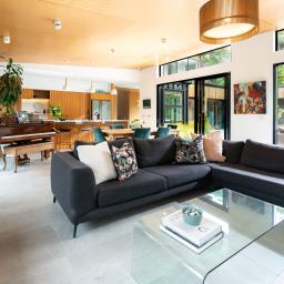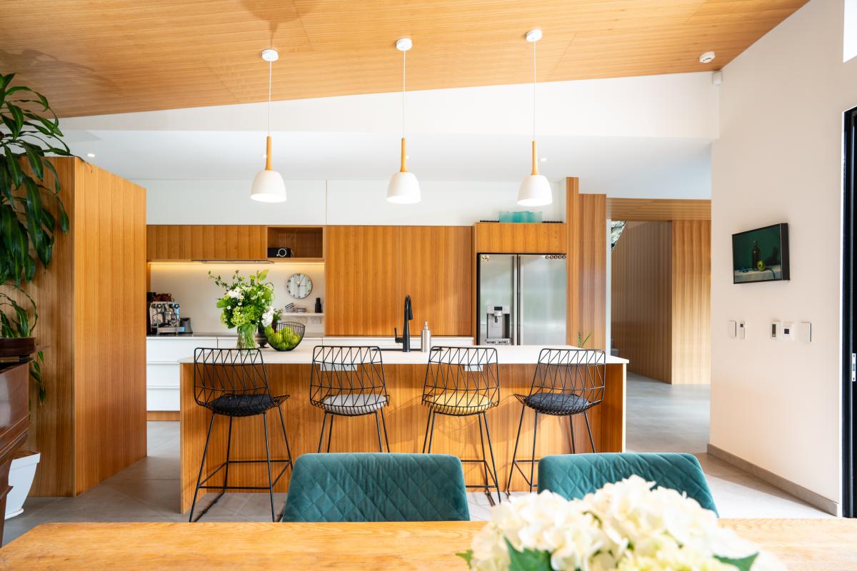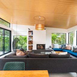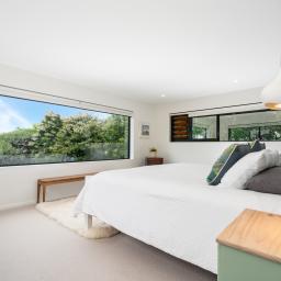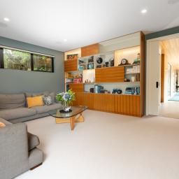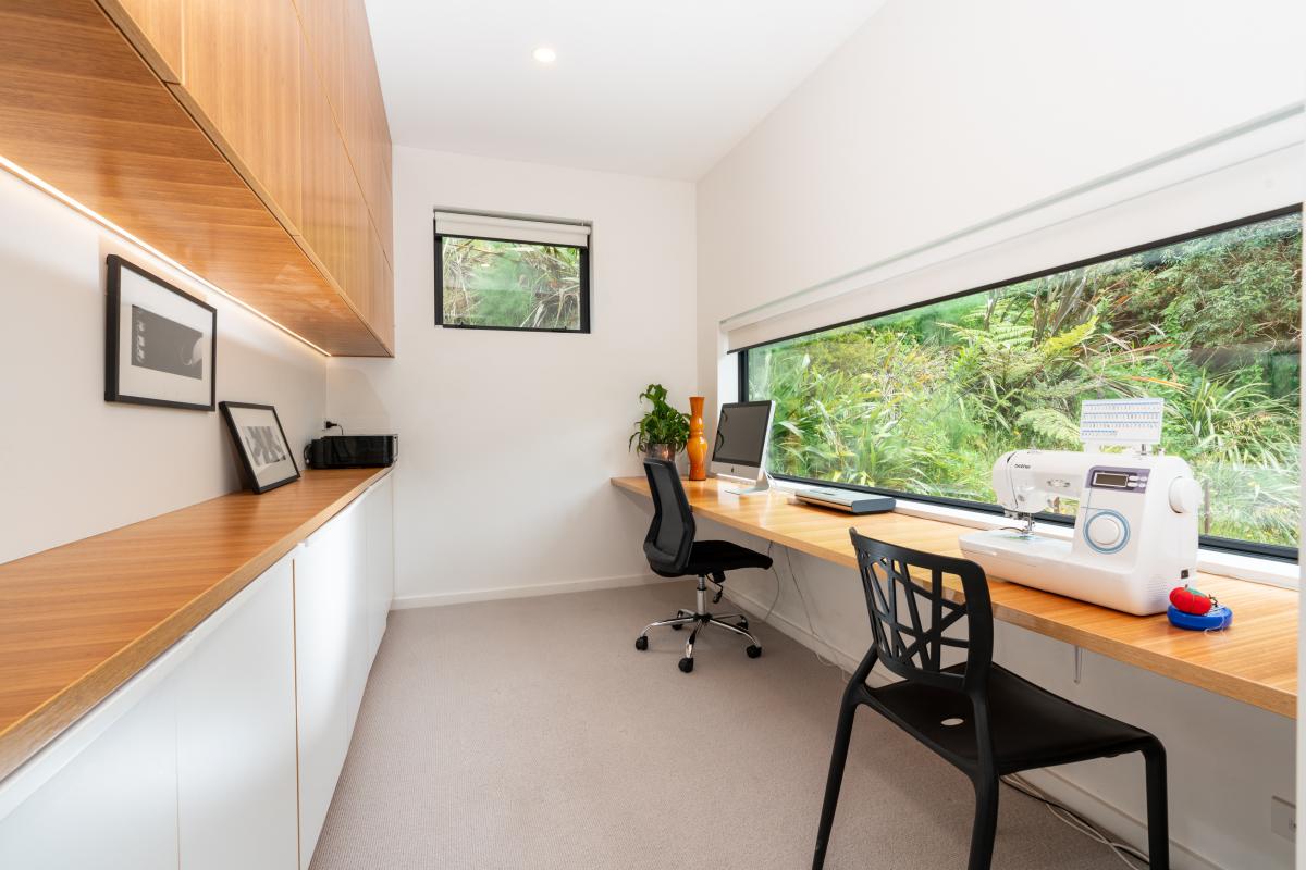Inside, the main living level is oriented for sun, views and seamless indoor-outdoor flow. -Open plan spaces anchored by a contemporary kitchen extend to a deck framed by native trees-ideal for relaxed afternoons or entertaining in complete privacy. A second lounge adds flexibility for families, while modern conveniences make everyday life effortless. Three bedrooms sit alongside the main living areas, complemented by a large separate laundry and home office with built-in storage and desk.