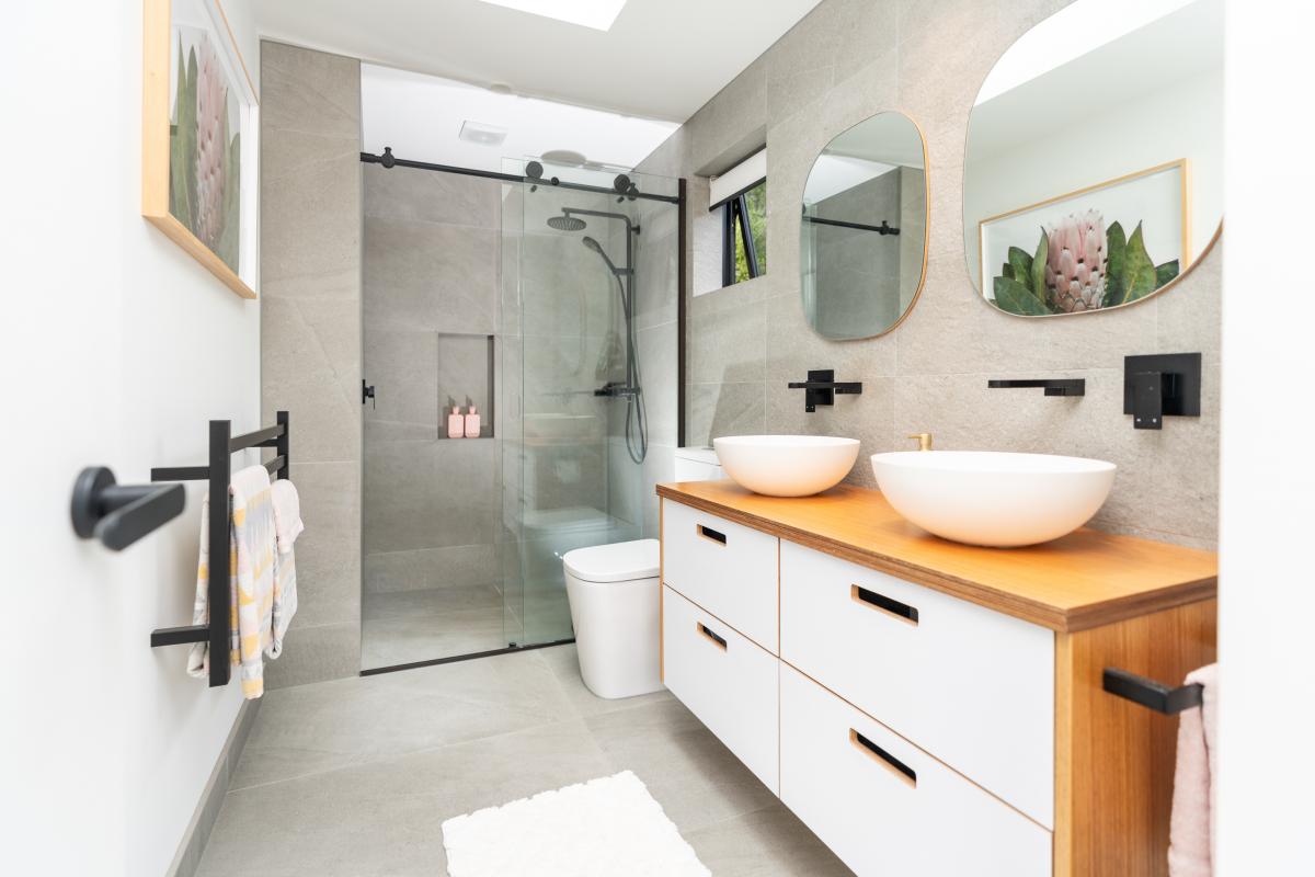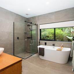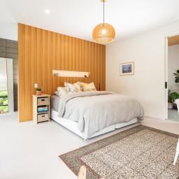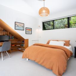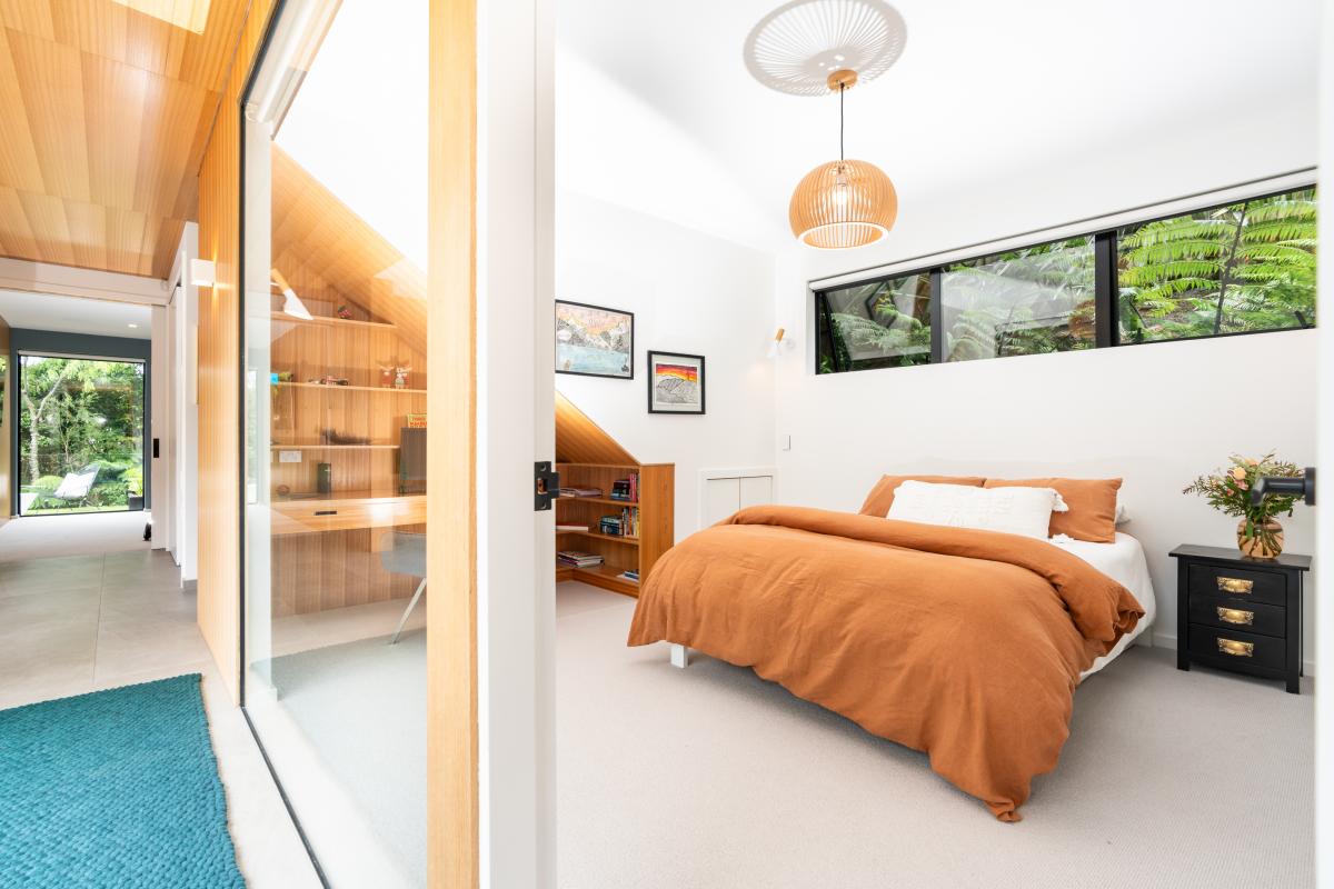 The entire top floor is devoted to a calm main suite retreat with elevated views across the native canopy and the harbour beyond. Here you'll find a gallery leading to a walk-in wardrobe, linen cupboard and ensuite. Downstairs, the adaptable rumpus suits teens, guests, a gym or media room, which opens onto a private deck and garden. Storage is plentiful throughout, including an oversized, insulated garage. Wide turning areas make arrival simple, whether you're parking the camper or welcoming visitors.