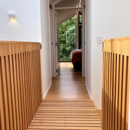 - Sublimely designed with contemporary flair, the polished concrete heated ground floor contrasts birch ply ceilings and joinery and Tasmanian oak floors on the upper levels.