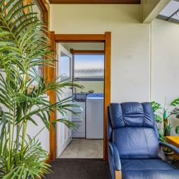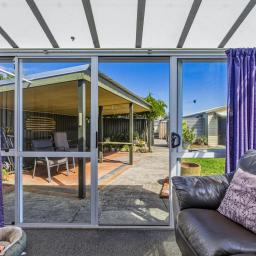 Outdoor spaces are generous and varied. The large covered patio at the rear offers shelter for gatherings, while the substantial double garage and additional workshop provide ample storage and workspace options. From here, step through to a private patio and viewing platform overlooking the Whanganui Racecourse — a unique vantage point to enjoy the outlook.