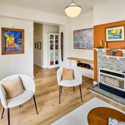 - Comfortable living area featuring the original fireplace surround fitted with a gas heater