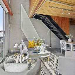 - Cool, modern interiors with timber ceilings, concrete panels, ply joinery, and a standout metal staircase