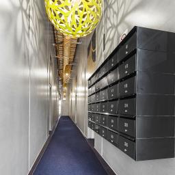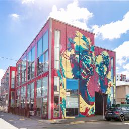 - Second-floor position in a well-known low-rise building with a bold street-art mural