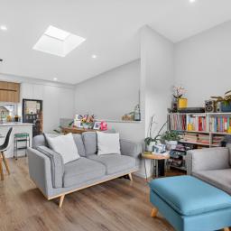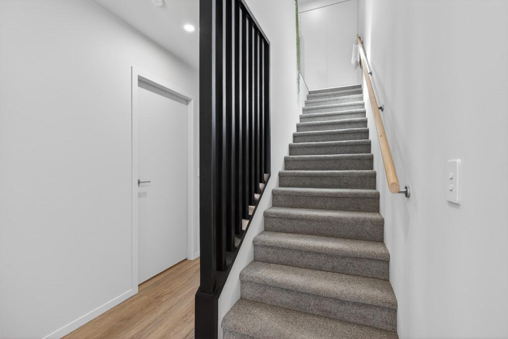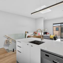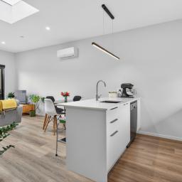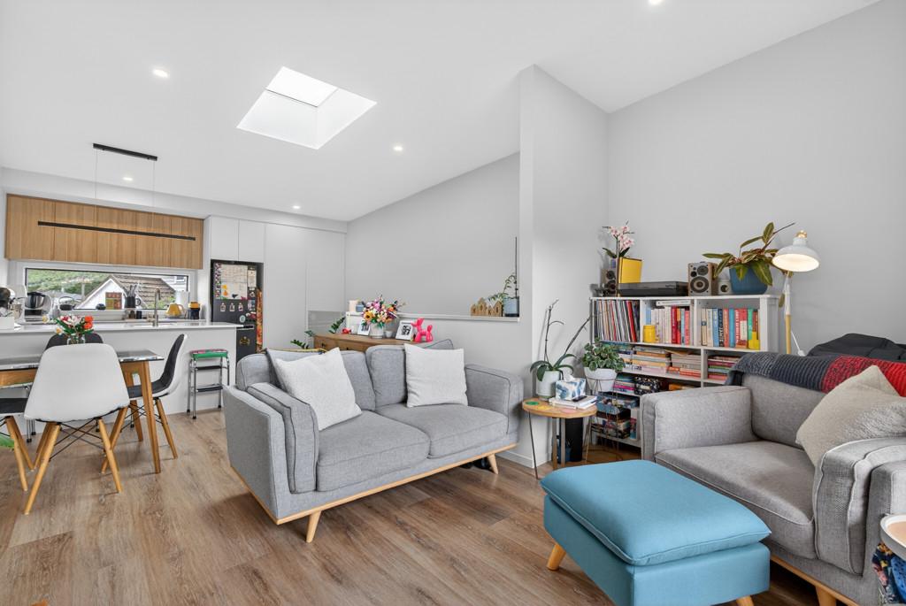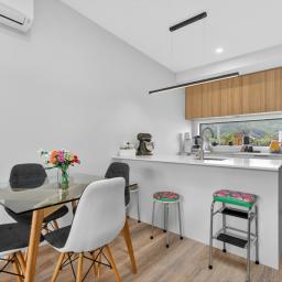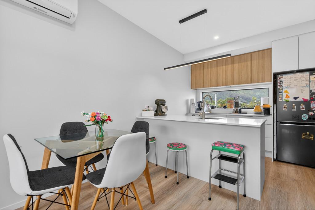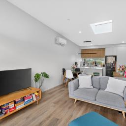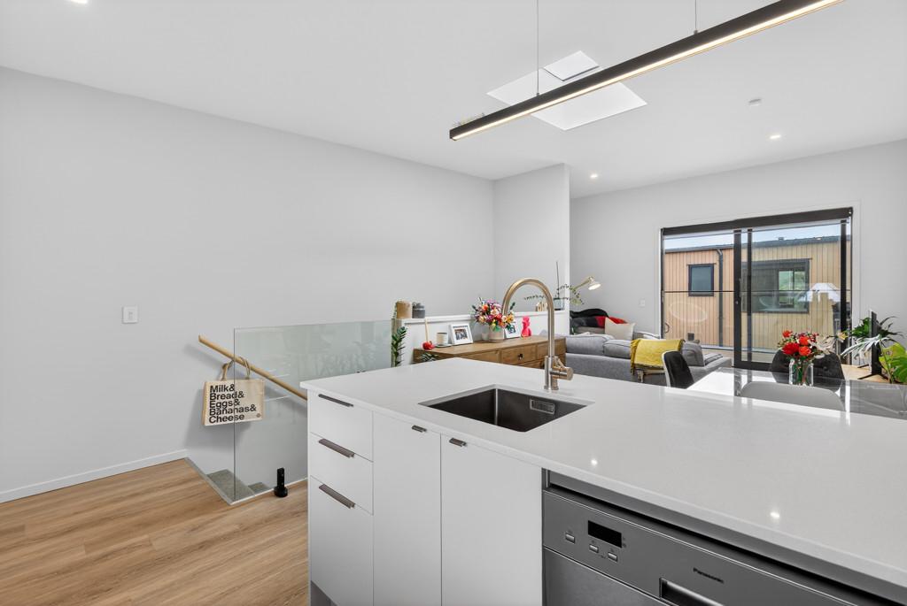 Upstairs is dedicated to light-filled, open-plan living. The modern kitchen, complete with Panasonic appliances and excellent pantry space, flows seamlessly to the dining and living areas. A cleverly tucked-away laundry and handy understairs storage add practicality, while the living space extends out to a well-proportioned north-west facing deck, ideal for soaking up the afternoon and evening sun.