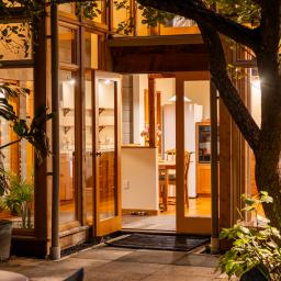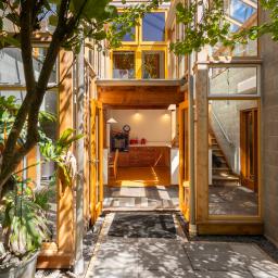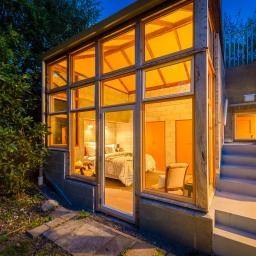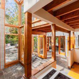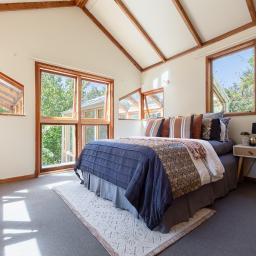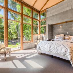 Large bay windows frame established canopy, placing living and bedroom spaces directly within green outlook. One wing sits grounded and intimate against the land, while the opposing volume reaches into light and courtyard connection.