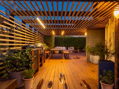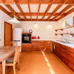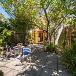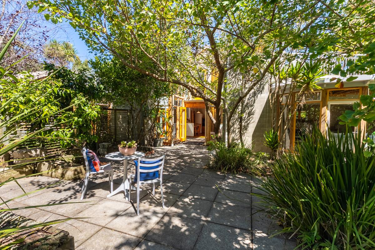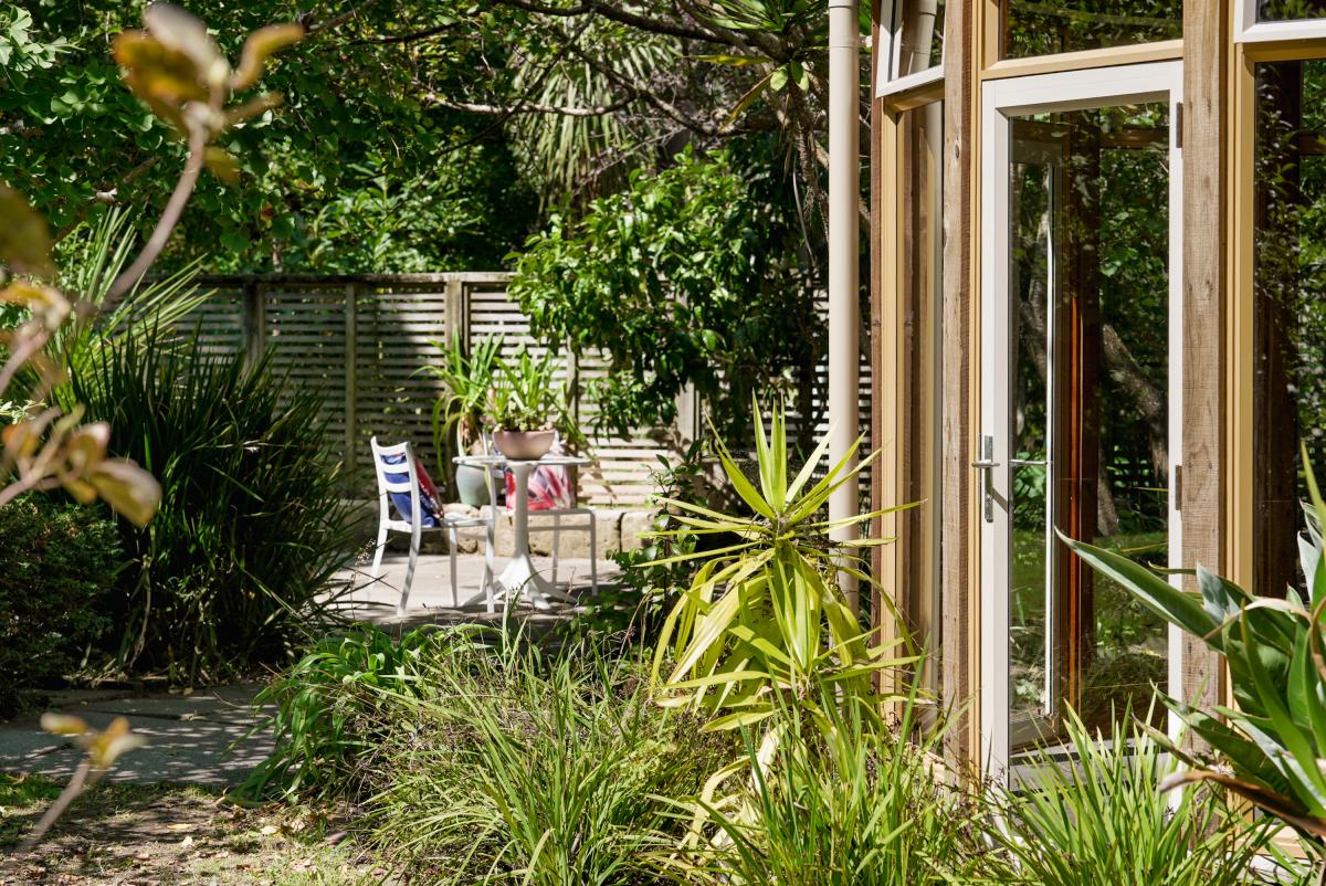 The kitchen flows outward to a sheltered paved terrace, creating a seamless transition between interior and planting.
