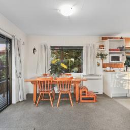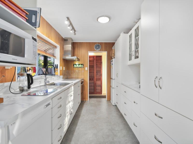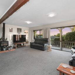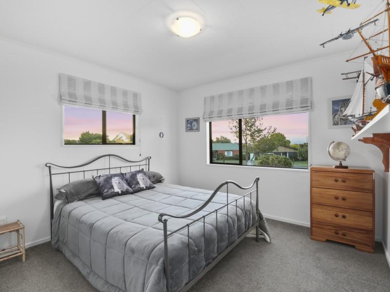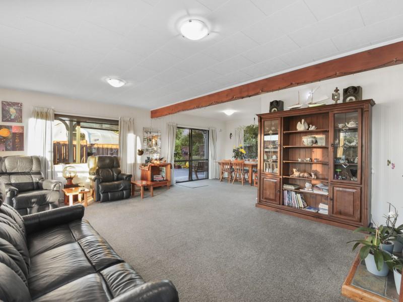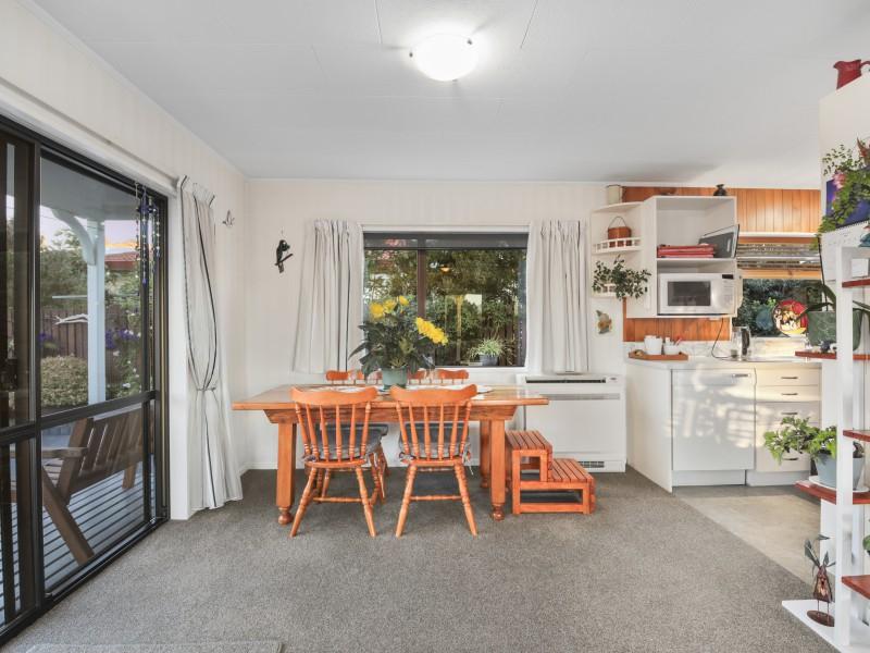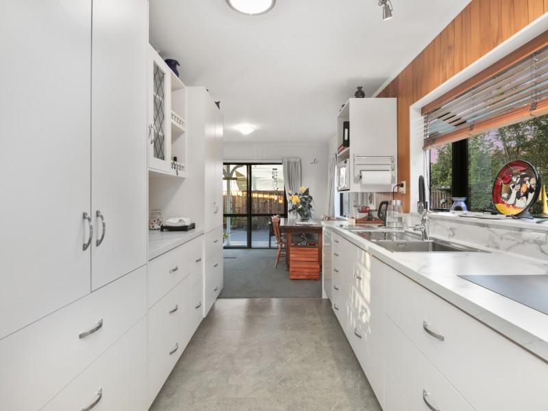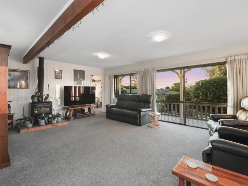 At the heart of the home, a light-filled galley kitchen offers ample cupboard space and flows seamlessly into the open-plan dining area, which leads through to a spacious living room. Comfort is assured year-round with both a wood fire and heat pump creating a warm and inviting environment.