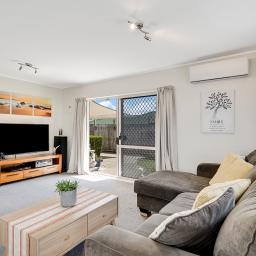 Additional highlights include a heat pump for year-round comfort, a heated towel rail, and a ventilation system that keeps the home fresh. The property a single garage with internal access, plus an open parking space for extra vehicles or guests.