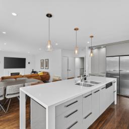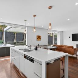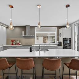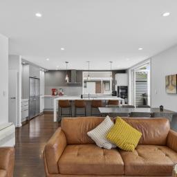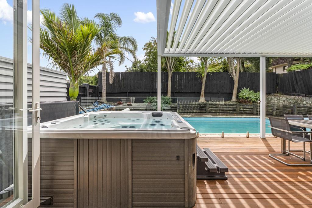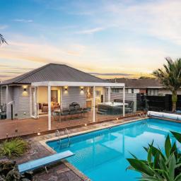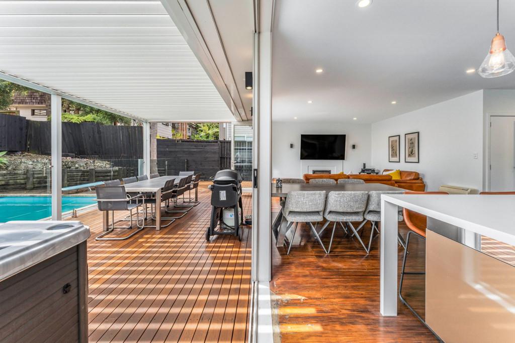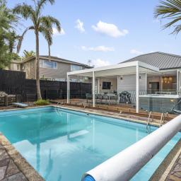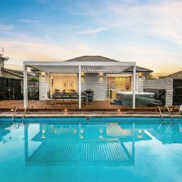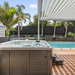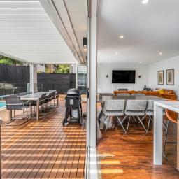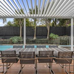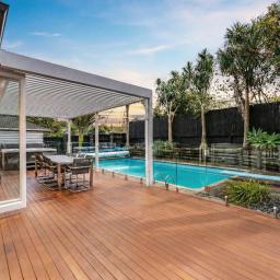 The heart of the home is a sprawling open-plan kitchen, dining, and lounge area that occupies its own wing. This sun drenched space flows naturally out to an expansive deck, equipped with a Louvretec system to ensure your hosting duties continue year round, regardless of the weather. Beyond the deck, the north facing grounds transforms into a private resort, featuring a sparkling swimming pool and spa framed by lush, tropical landscaping that makes every day feel like a vacation.