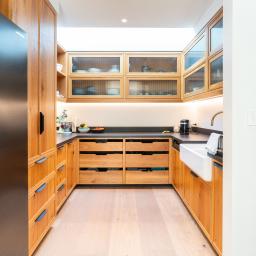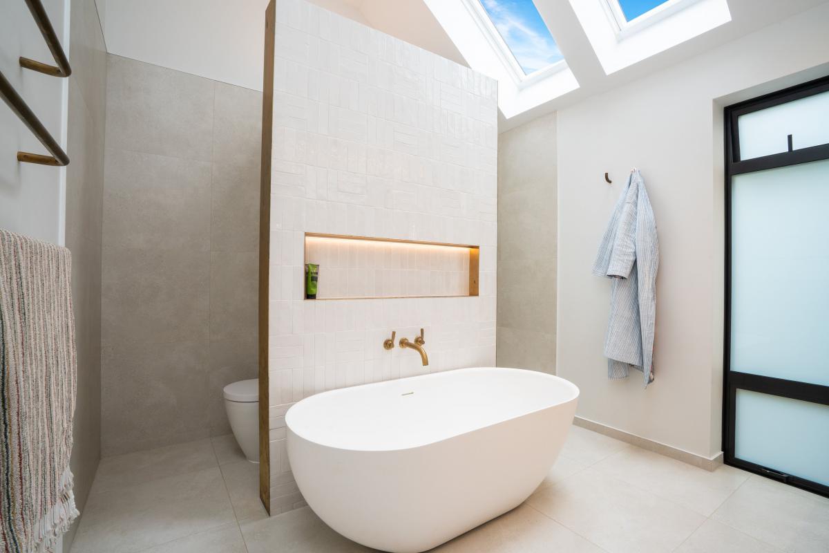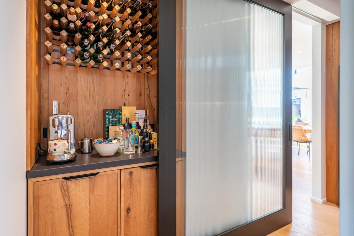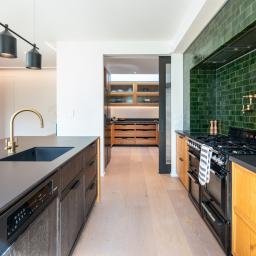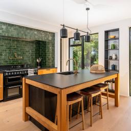 The main house unfolds across two levels, with the ground floor dedicated to relaxed family living and entertaining. At its centre sits a picture-perfect kitchen — rich in design detail — with green ceramic tiles, oak framed island and Perrin & Rowe tapware. A generous scullery discreetly handles the working side of the kitchen, while a lightwell and fluted glass cabinetry add warmth and character. A family-sized laundry is positioned nearby for convenience.