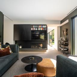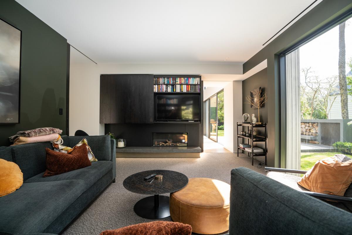 Open-plan living flows outdoors to a landscaped entertaining area with outdoor fire and a garden designed by Xanthe White. Inside, back to back fireplaces anchor both the main living space and a moody media room — a cocooning retreat with dark walls and built-in cabinetry. Also on this level is a generous guest bedroom with its own ensuite, plus an opulent guest w/c.
