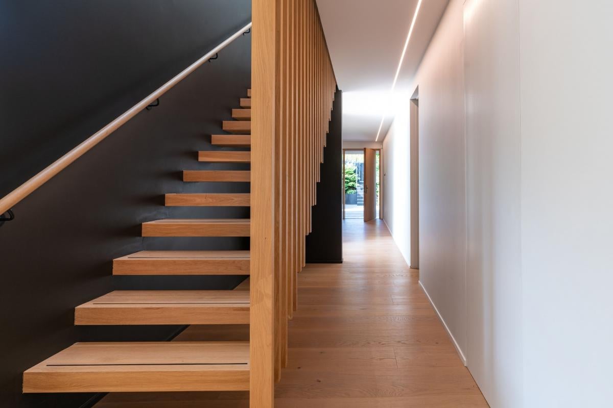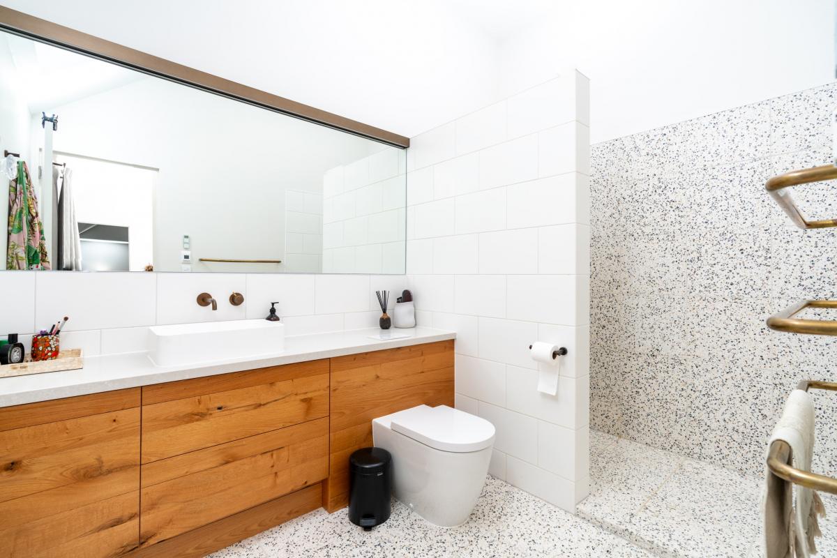 Upstairs, a double-height mezzanine enhances the sense of space and connection. The main bedroom suite is expansive, with both built-in and walk-in wardrobes, and a serene ensuite featuring bath, shower, dual basins and a discreet WC. Two further ensuited bedrooms mirror each other, each with excellent wardrobe space and beautifully finished terrazzo bathrooms.