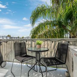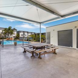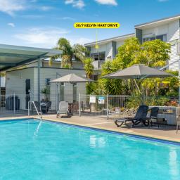 The oversized living area transitions seamlessly to a private, sun-soaked balcony-the perfect spot to relax while overlooking the manicured gardens and sparkling pool. Inside, the home is modern and well-appointed, featuring a sleek kitchen, a stylish bathroom with a compact laundry, and a large double bedroom.