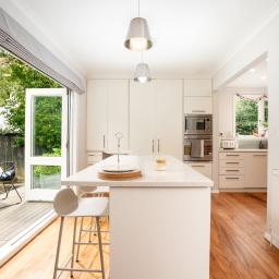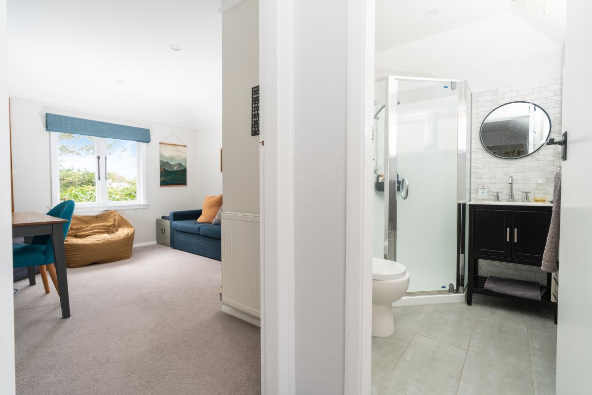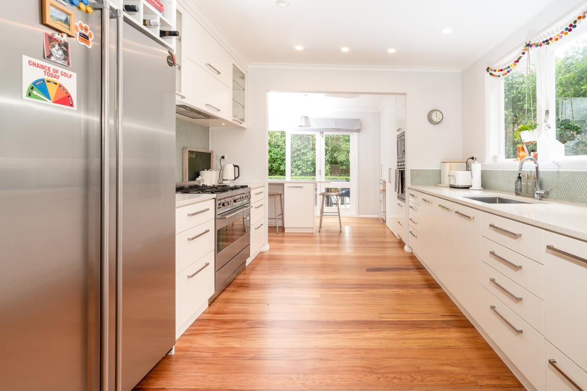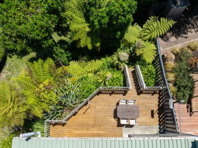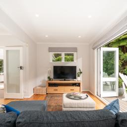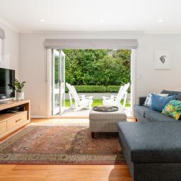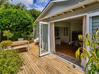 - Open-plan living/dining and entertainers' kitchen with heart rimu flooring and two sets of bi-fold doors to a west-facing deck that steps out to flat lawn, leafy seclusion and an al fresco terrace for the ultimate indoor-outdoor idyll