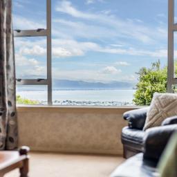 The kitchen connects seamlessly with the dining area, where elevated harbour views form a striking backdrop. A separate living room offers additional space to unwind and flows into a conservatory that captures sweeping views across the water and surrounding hills.