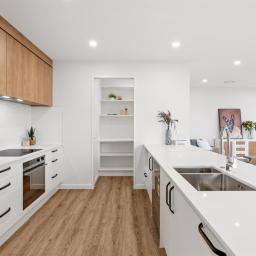 The kitchen is modern, spacious and thoughtfully designed. White cabinetry is complemented by warm timber detailing, creating a clean and inviting look. There is generous bench space, quality appliances and a walk in pantry that supports daily use as well as hosting.