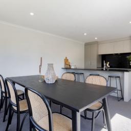 Bathed in natural sunlight, the open plan living zone is warm and welcoming, seamlessly connecting the dining area, living space, and contemporary kitchen. Designed as the heart of the home, the kitchen features sleek stone benchtops and quality Bosch appliances. A heat pump ensures year-round comfort.