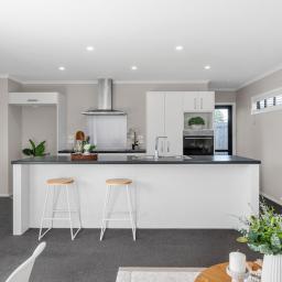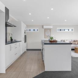 Downstairs is designed for real life. The kitchen anchors the home with generous bench space, quality appliances and a long breakfast bar that naturally becomes the social hub. It flows seamlessly into open plan dining and living, creating a space that feels connected yet comfortable. Ranch sliders lead out to a fully fenced outdoor area that is secure, low maintenance and ideal for kids, pets or summer evenings with friends. A guest toilet on the lower level adds practicality, while the heat pump ensures year round comfort.
