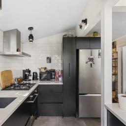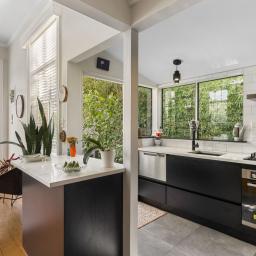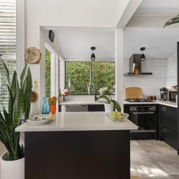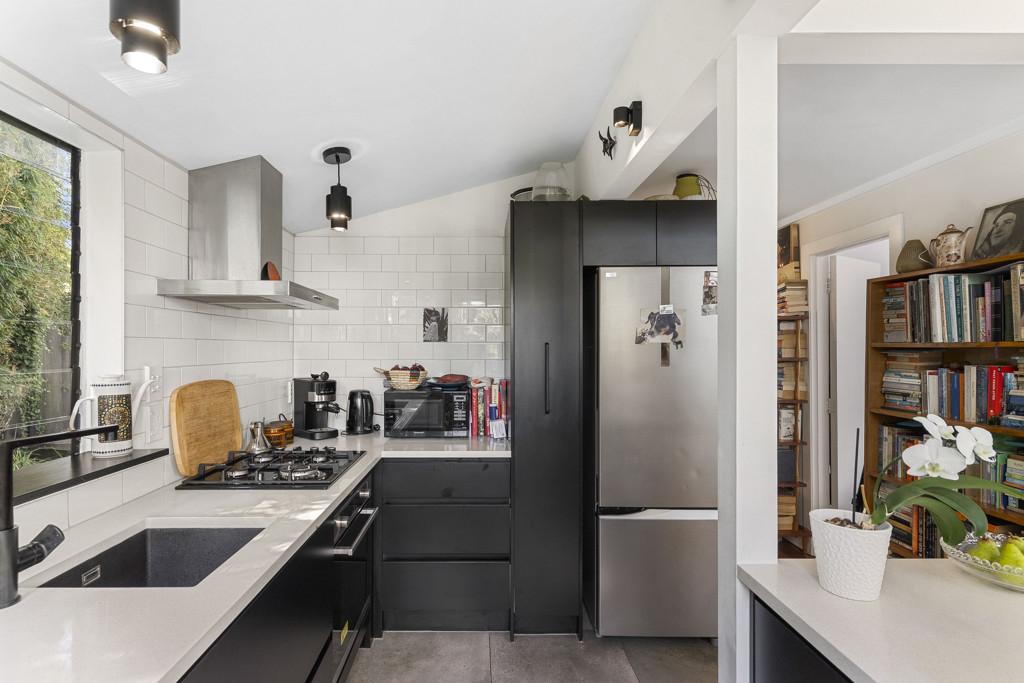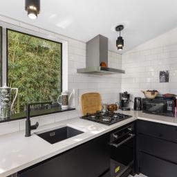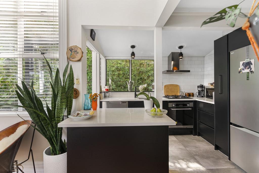 The home is discreetly positioned down a private ROW, facing north for sun, warmth and wellbeing. Once inside; you'll love the show-stopper kitchen, beautifully designed, black-and-white themed, with gas cooking. The very stylish louvered glass windows enhance the space, plus there's a handy side door opening to the deck.