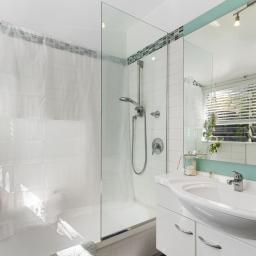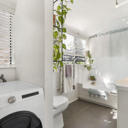 The family bathroom is generous in size, with shower-over-bath, a combined laundry, and stylish glass louvered windows.