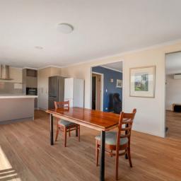 At the centre of the home, the well-appointed kitchen includes a wall oven, cooktop and dishwasher, flowing naturally into open-plan dining and lounge areas that create a welcoming hub for everyday living and entertaining.