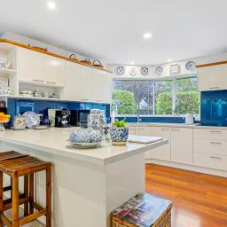 At the heart of the home, the kitchen is generous in scale and perfectly positioned for connection. Expansive stone benchtops and excellent storage make this a space designed for entertaining and everyday living. It flows effortlessly to both the dining area and multiple living zones, creating a home that adapts beautifully to family life and social gatherings alike.